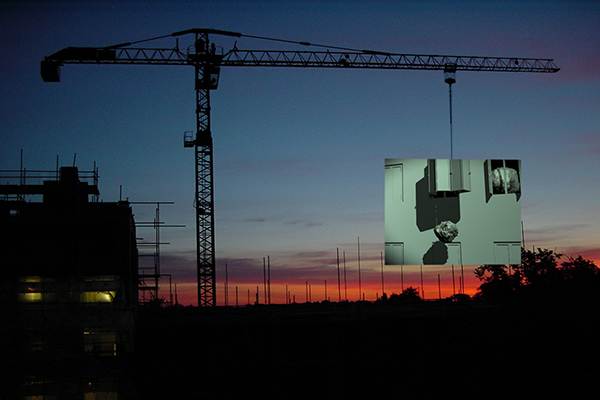 The panel catches part of the video projection. Through the motion of the crane boom the visual content is „scanned“. The video itself shows the computer simulated and estranged façade of the emerging building in a fixed