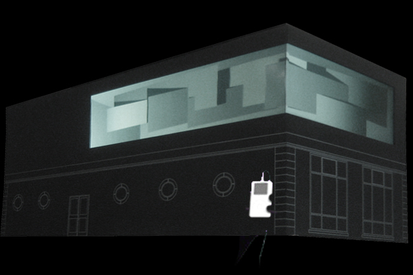 The HBKSaar School of Fine Arts is located on the border of the baroque Ludwigsplatz. The gallery is a newly built second floor on top of an adjoining building. The large-scale glass corner opens the room towards the public square, from which there is a good insight into the gallery space during the day. At nightfall a motor-powered curtain shaped rear-projection is spanned behind the glass construction. Video projectors spread a seamless picture over the entire window area.